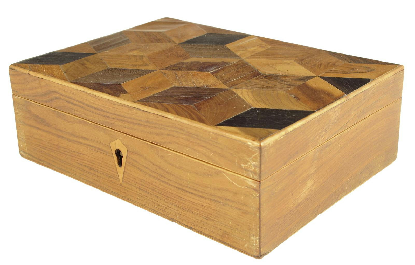 λ A Victorian Tunbridge ware and rosewood box, with a specimen wood parquetry cube panel to the lid, 6.2cm high, 19cm wide, 13.8cm deep.