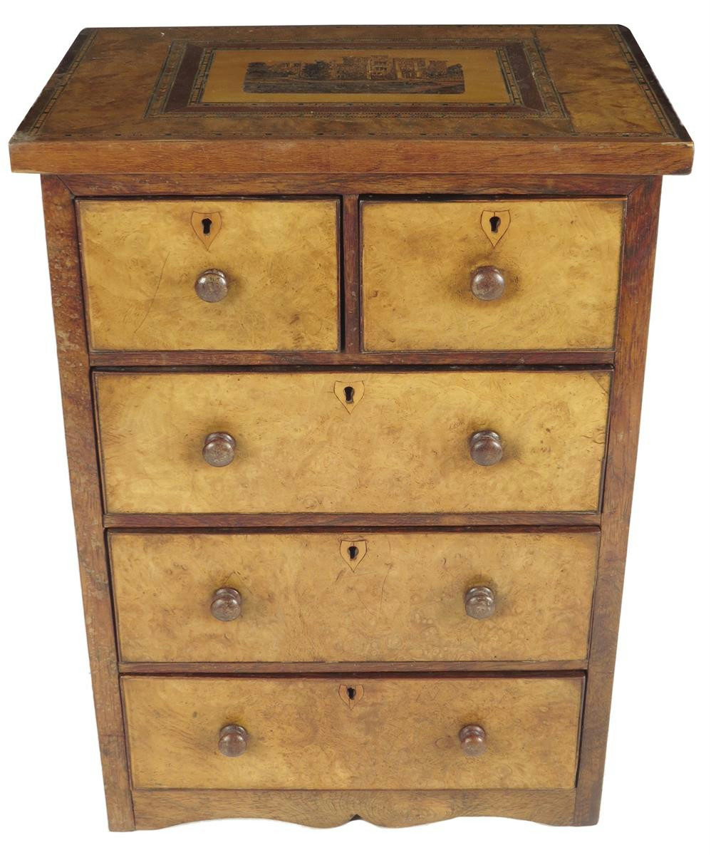 A Victorian Tunbridge ware and burr walnut miniature chest, the rectangular top with a view of Hever Castle, above two short and three long drawers, the bottom one fitted with a hinged writing slope, two secret drawers and compartments, 49.7cm high, 36.5cm wide, 25cm deep.