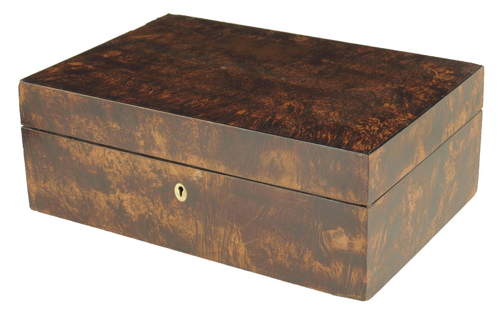 An early 19th century stained maple sewing box, with a mirror to the inside of the lid and a paper lined interior, with a divided lift-out tray, 11.8cm high, 32.5cm wide, 22cm deep.