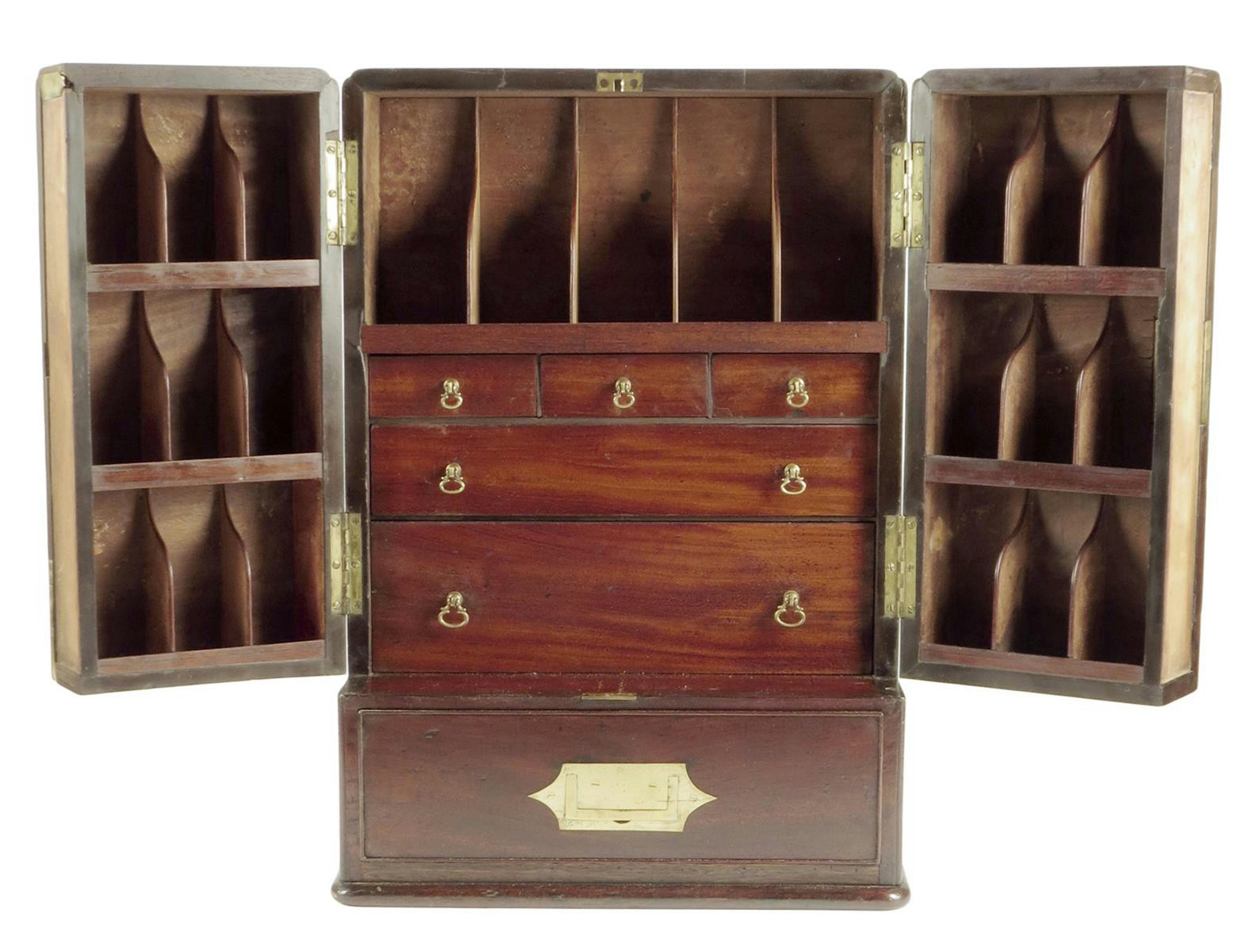 A large George III mahogany apothecary's box, with a pair of hinged doors enclosing a fitted interior with twenty-three divisions, three short lidded drawers and two long drawers, the base with a drawer fitted with a sunken brass handle, the reverse with a sliding panel revealing five divisions with four glass bottles, 51cm high, 36cm wide, 25.3cm deep.