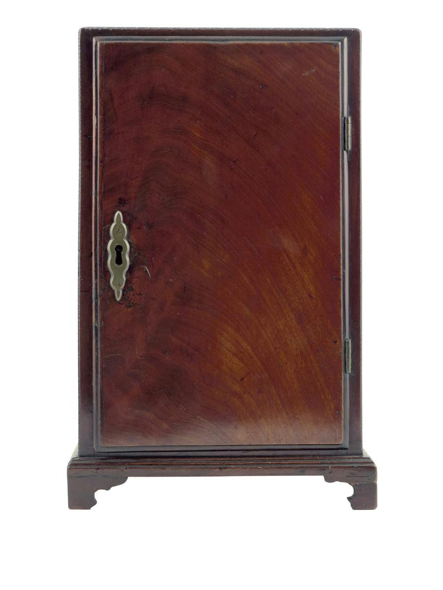 A mahogany table cabinet, with carved decoration to a moulded edge door, enclosing an arrangement of eight short and one long drawer with brass handles, George III elements and later, 34.3cm high, 232cm wide, 16cm deep.
