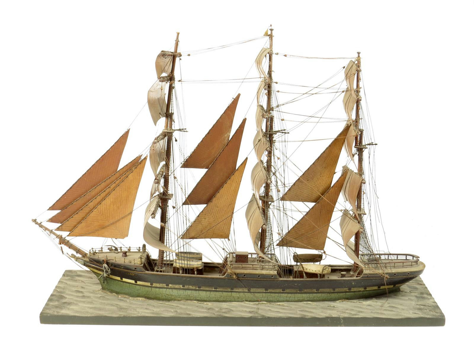 A carved and painted wood model of S.S. Irex, with wooden sails to a planked hull and carved figurehead, on a naturalistic plinth base, late 19th / early 20th century, 52.5cm high, 71cm wide, 23.3cm deep,.