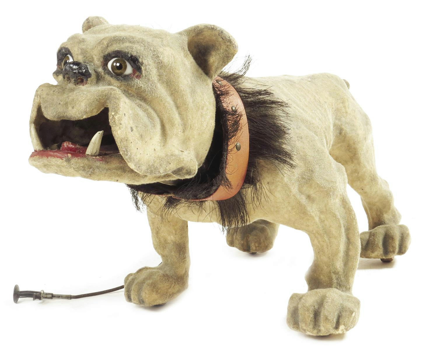 A French papier-mâché and felt model of an English bulldog, with glass eyes, nodding head and growler lead, on wooden castors, late 19th / early 20th century, 37.5cm high, 63cm long.