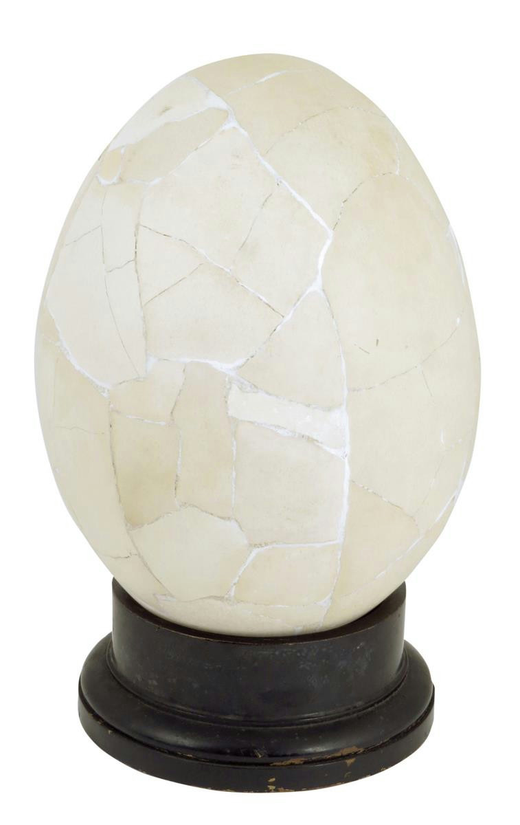 A reconstructed elephant bird egg (Aepyornis Maximus), on an ebonised stand, 31cm high, 20.5cm wide. (2)