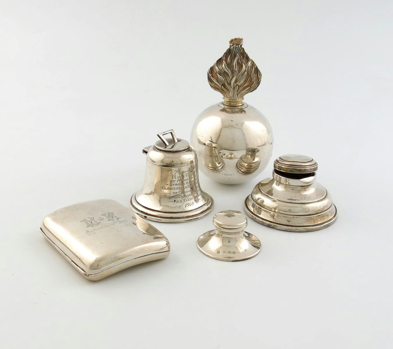 comprising: a table cigar lighter modelled as a grenade, London 1894, plus an inkwell modelled as a bell, with a hinged cover and presentation inscription, a cigarette case, plus two capstan inkwells. (5)
