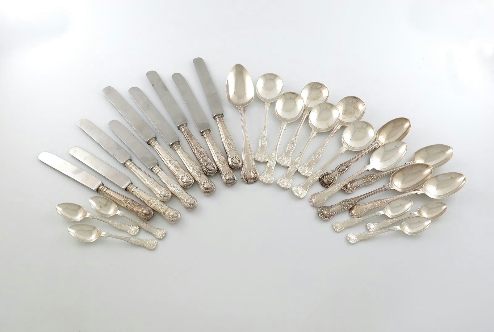 λ A mixed lot of silver King's and Queen's pattern flatware, various dates and makers, comprising: a set of six soup spoons, Sheffield 1971, five dessert spoons, a set of six teaspoons, a tablespoon, five table knives, and four dessert knives, approx. weighable 30oz. (27)