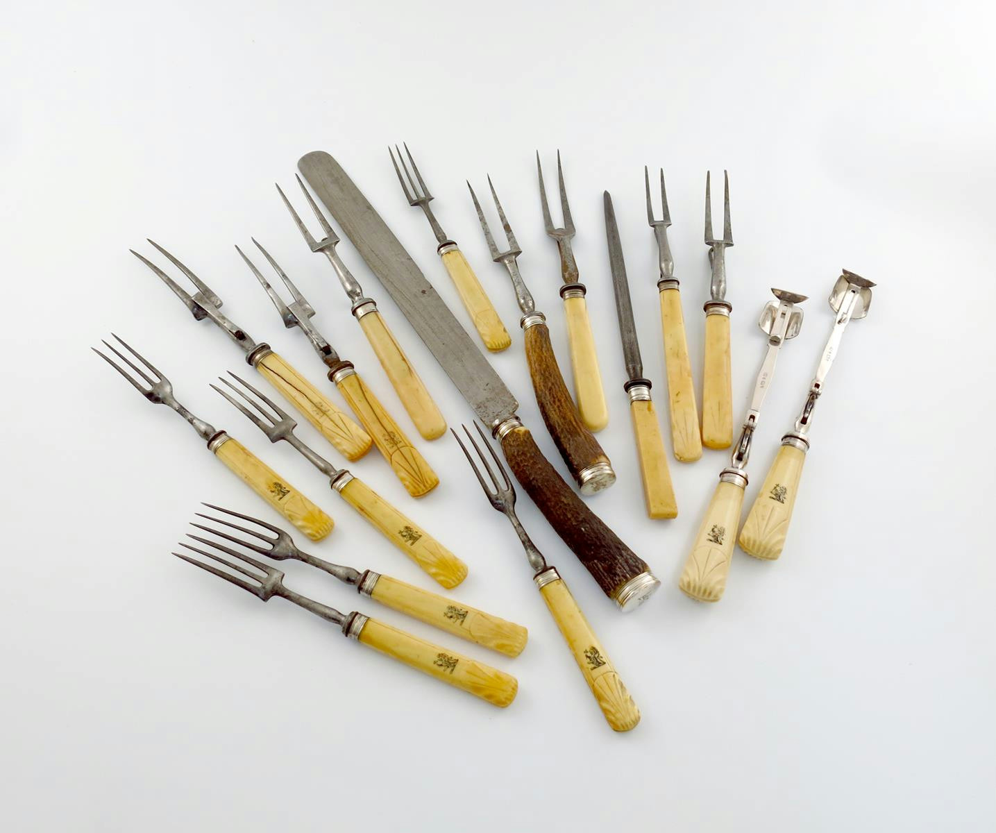 the terminals with the Russell crest, comprising a a pair of close plated slide action stilton scoops, a set of six steel meat forks, a pair of carving forks, four further carving forks, a steel and a pair of ham carvers with antler handles. (15)