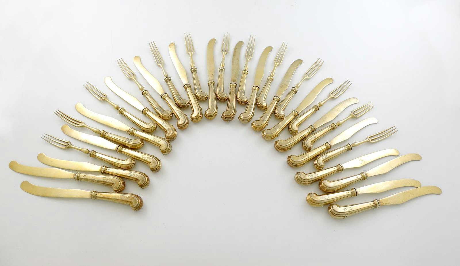 A set of nineteen George III silver-gilt dessert knives and thirteen dessert forks