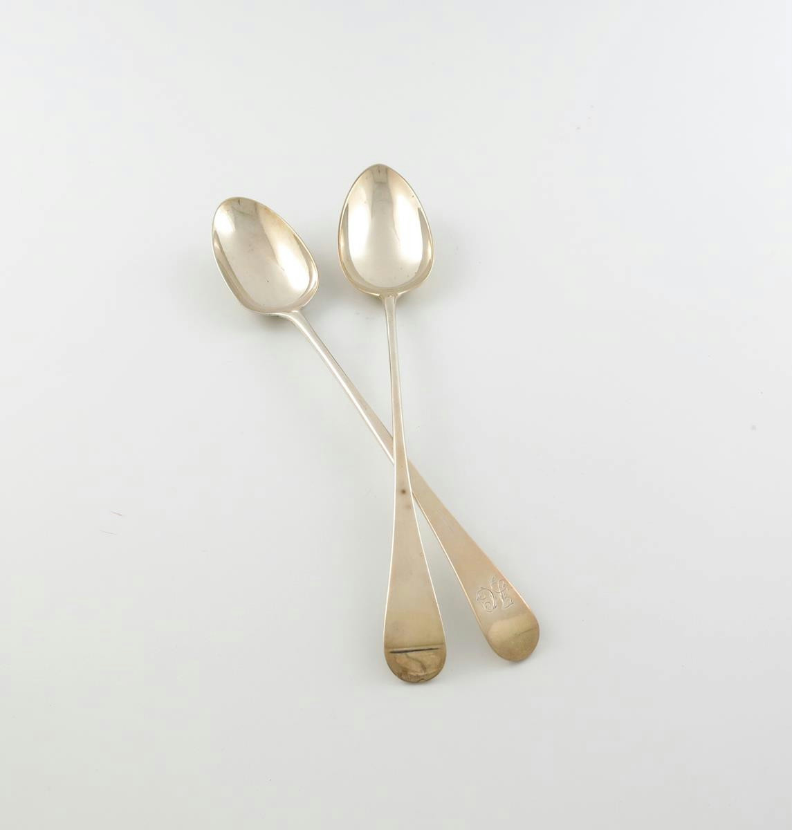 the terminal with a monogram, plus another George III silver Old English pattern basting spoon, by Thomas Wallis, London 1792, plain terminal, approx. total weight 6.5oz. (2)
