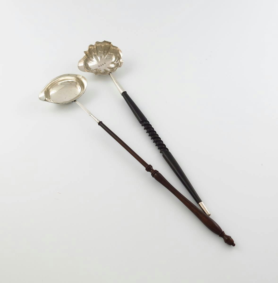 λ A George II silver punch ladle, maker's mark worn, London 1754, shaped oval bowl, turned twisted handle, length 38.5cm, plus a George III silver punch ladle, London circa 1800, oval bowl, twisted whale bone handle, approx. total weight 1.6oz. (2)