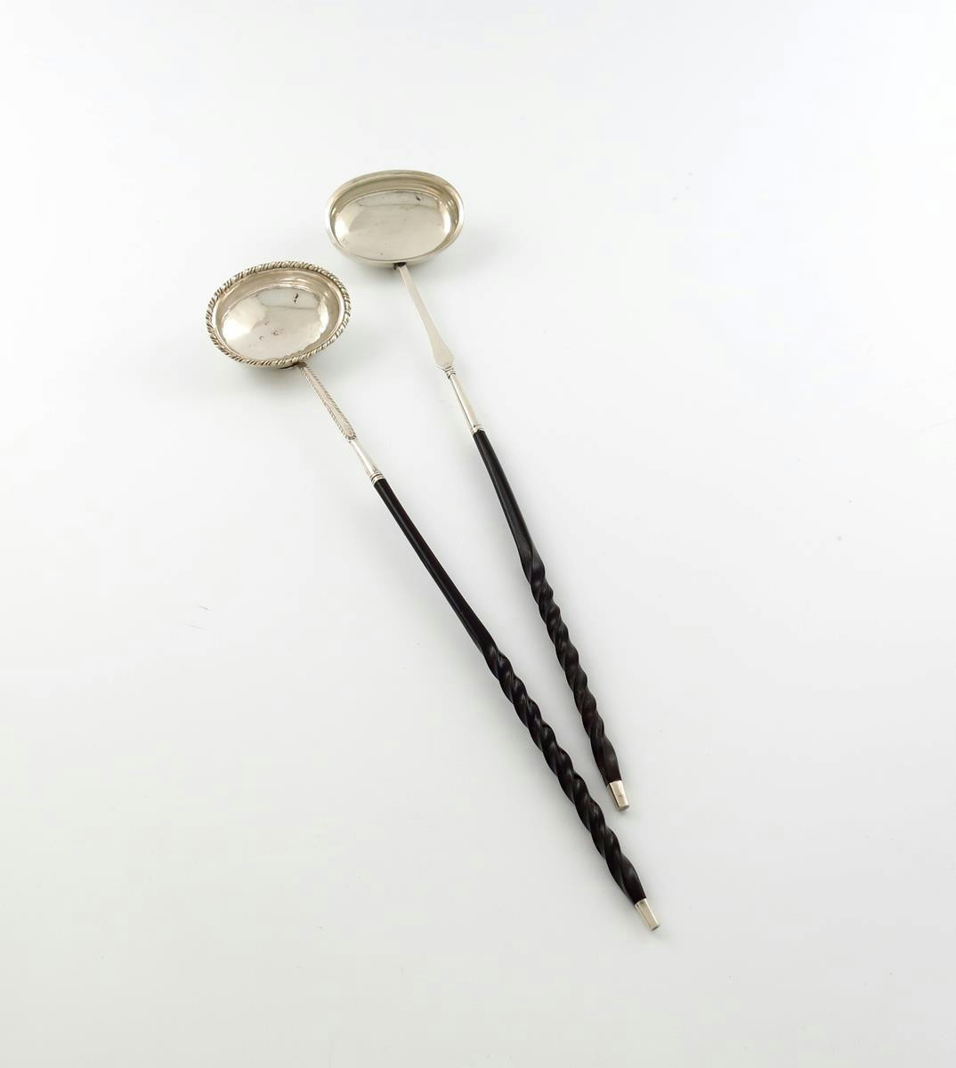 λ A George III provincial silver punch ladle, by Langlands and Robertson, Newcastle circa 1785, oval bowl, twisted whale-bone handle, plus a George III silver punch ladle, by Thomas Morley, London 1779, oval bowl, gadroon and feather-edge borders, twisted whale bone handle, length 38cm, approx. total weight 3.4oz. (2)