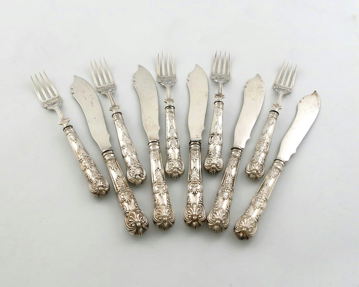 A set of five Victorian silver Queen's pattern fish knives and forks