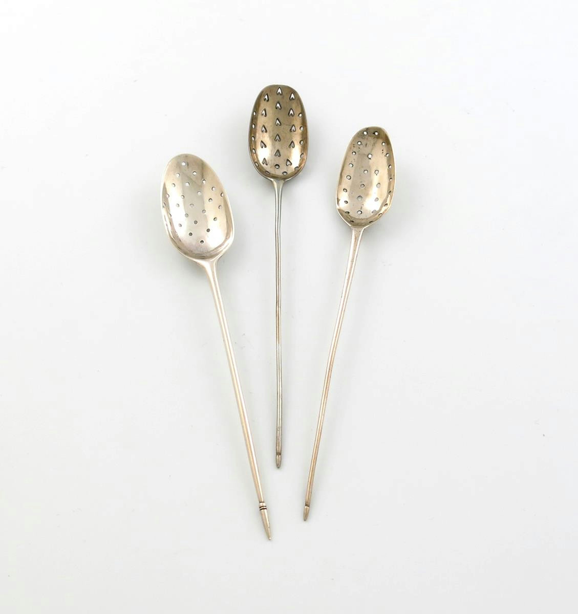 comprising: an early 18th century one with maker's mark partially lost, ?R, the bowl with plain piercing, one with pierced heart decoration, and one with worn marks, length of longest 15cm, approx. total weight 0.7oz. (3)