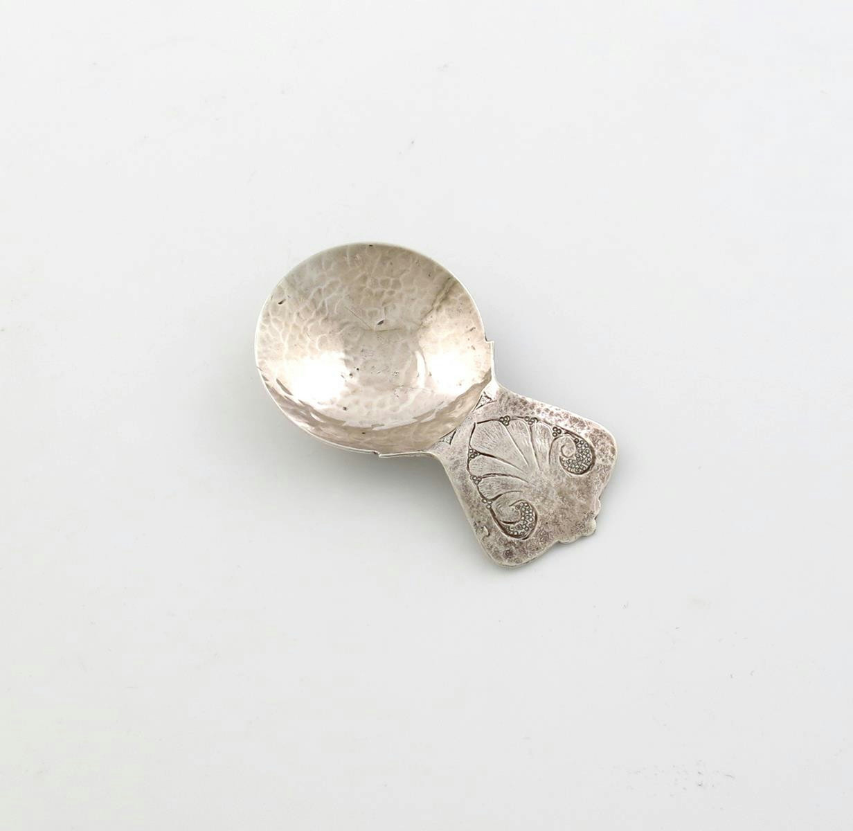 circular spot-hammered bowl, the spread handle with a foliate motif, length 8.2cm, approx. weight 0.9oz.