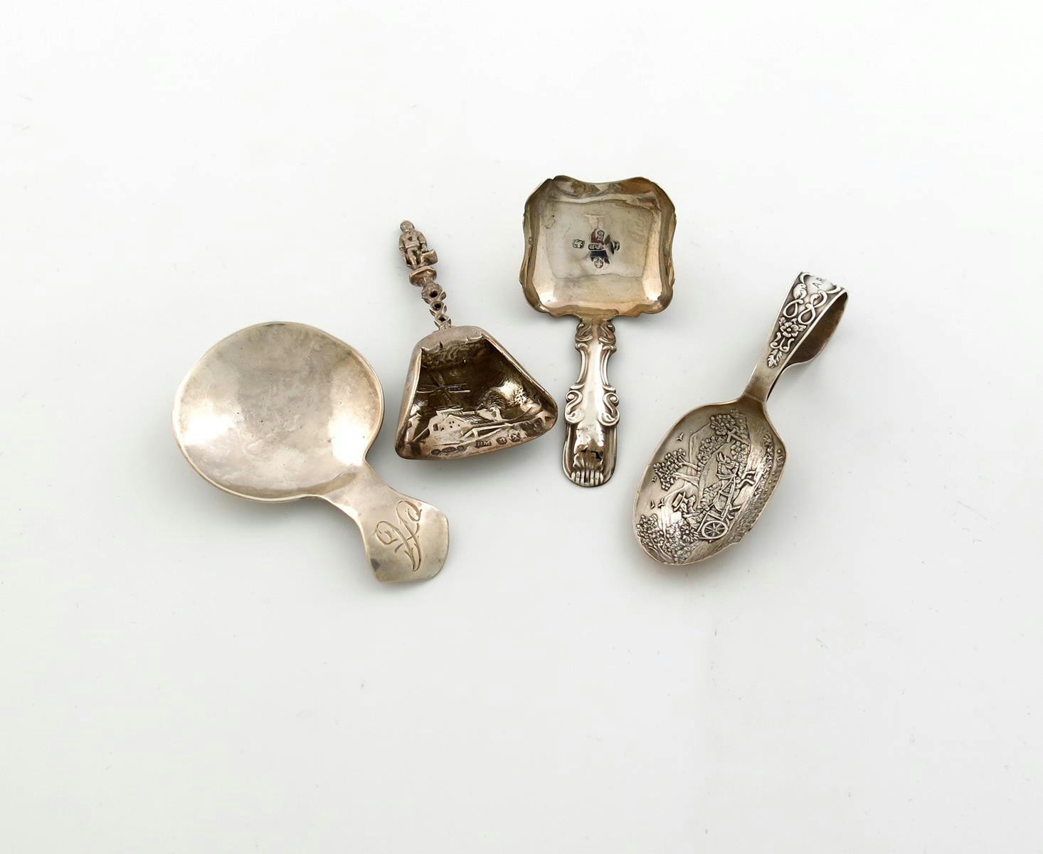 comprising: a George III caddy spoon, by Cocks and Bettridge, Birmingham 1816, a modern caddy spoon, London 1977, a continental spoon and a baby feeder spoon, approx. weight 1.8oz. (4)