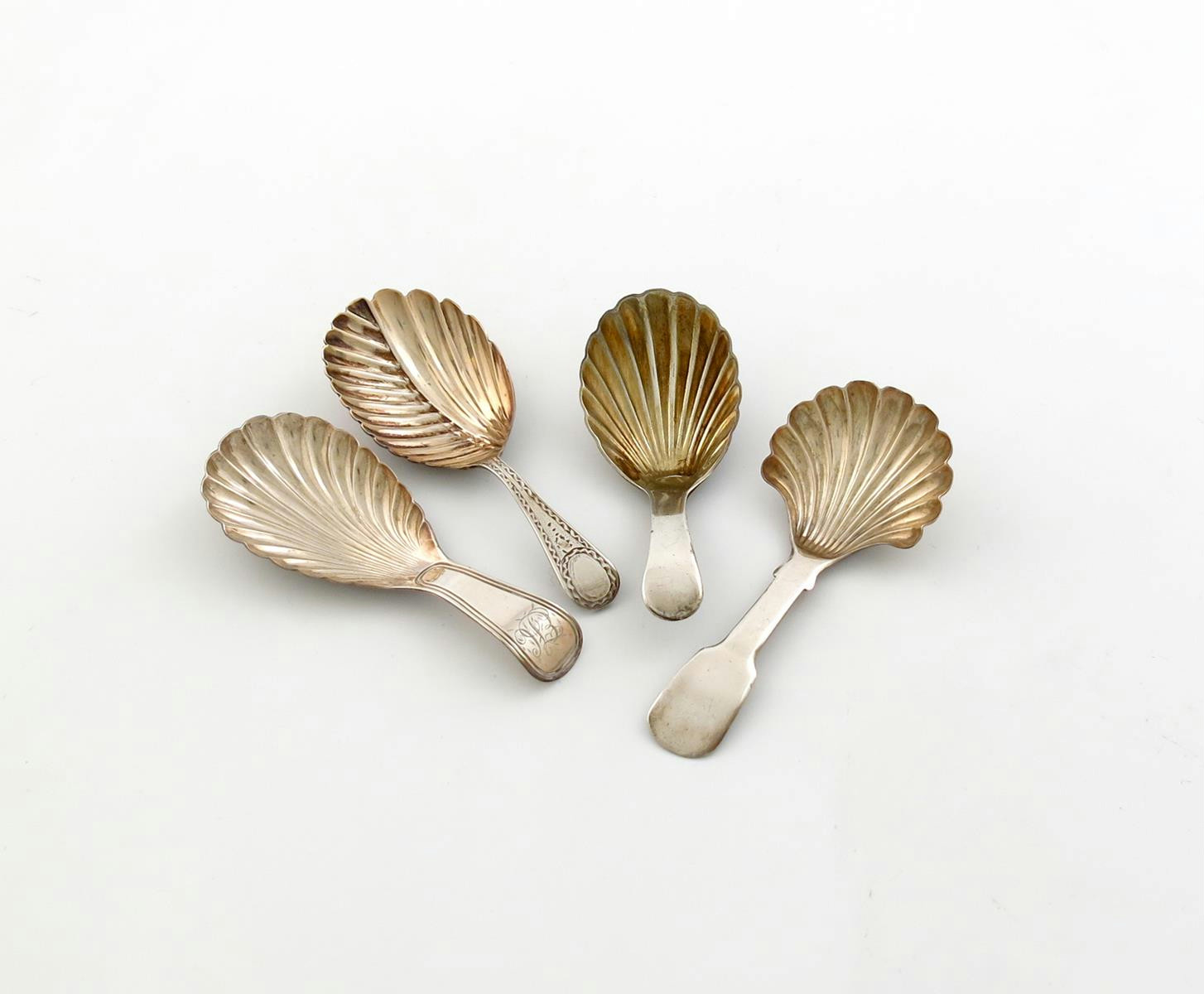 with fluted shell bowls, comprising: a George III caddy spoon, by Joseph Willmore, Birmingham 1814, one with a Fiddle handle, by Joseph Willmore, Birmingham 1830, one Old English pattern by Elizabeth Morley, London 1808 and one with Bright-cut decoration, London 1811, approx. total weight 1.2oz. (4)