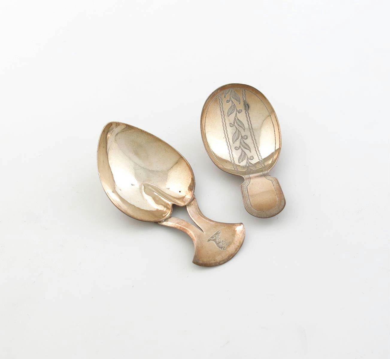 heart-shaped bowl, bifurcated handle, engraved with a crest, length 7.3cm, plus a George III silver caddy spoon, by Josiah Snatt, London 1807, oval bowl, engraved decoration, length 6.4cm, approx. total weight 0.5oz. (2)