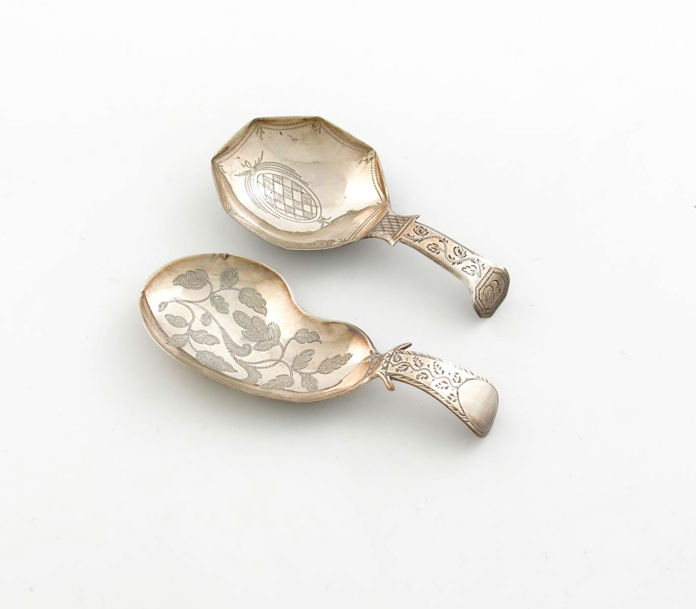 kidney shaped bowl, engraved foliate decoration, the handle with a fish-tail motif, length 7.3cm, plus George III silver caddy spoon, by IL, Birmingham 1807, octagonal shaped bowl, engraved foliate decoration, length 6.8cm, approx. total weight 0.4oz. (2)