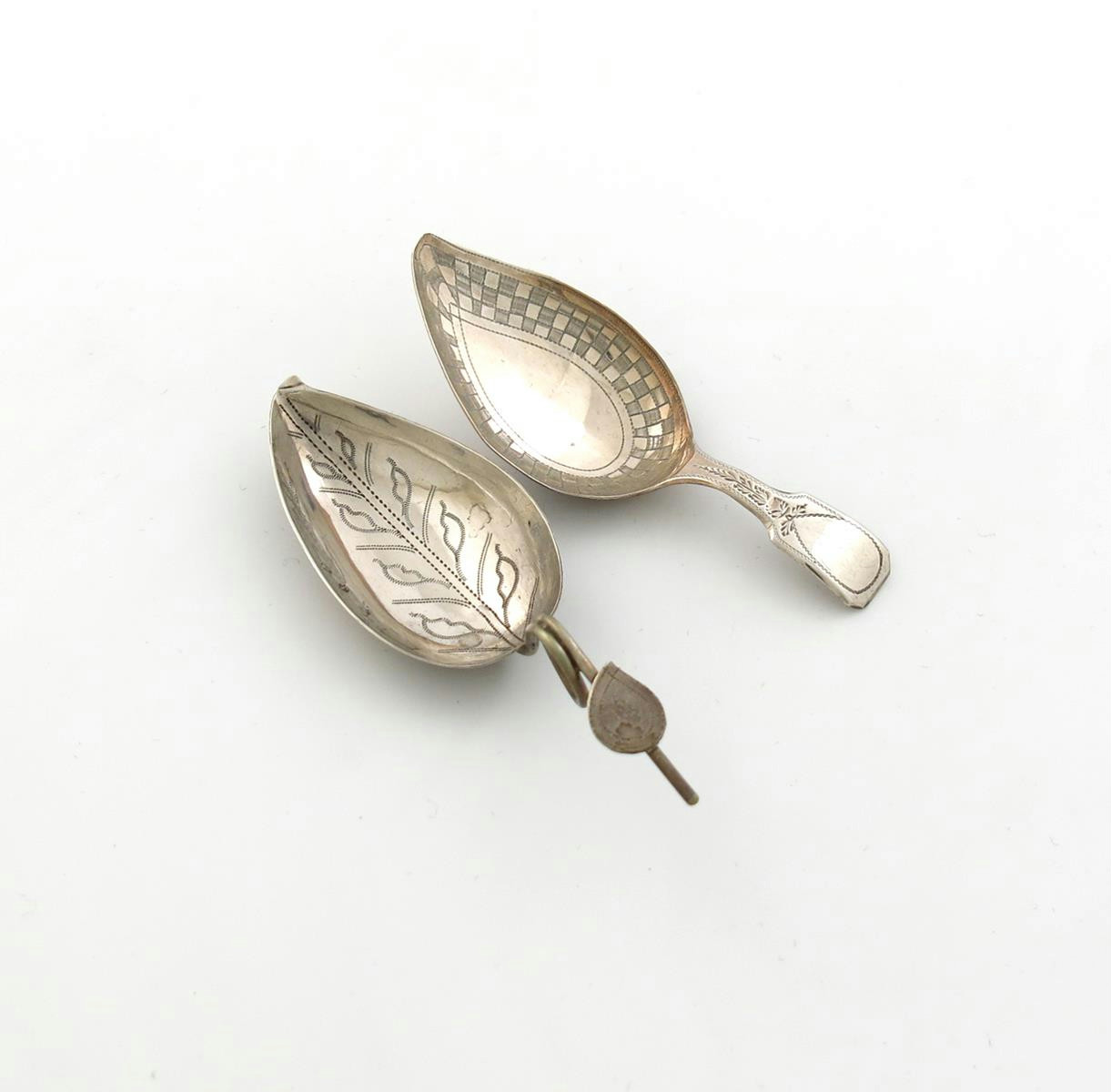 leaf shaped bowl, Fiddle pattern handle, engraved decoration, length 7.3cm, plus a George III silver caddy spoon, circa 1800, leaf shaped bowl, wire-work handle, the bowl with engraved leaf decoration, length 8.2cm, approx. total weight 0.3oz. (2)