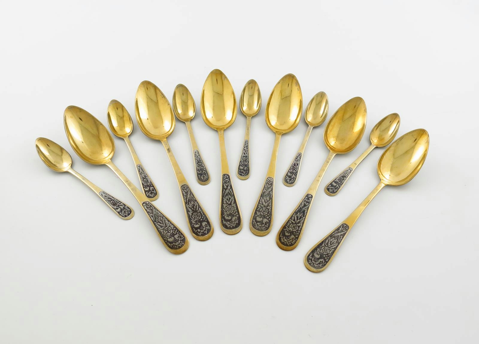 A set of six Russian silver-gilt and niello work tablespoons and six dessert spoons
