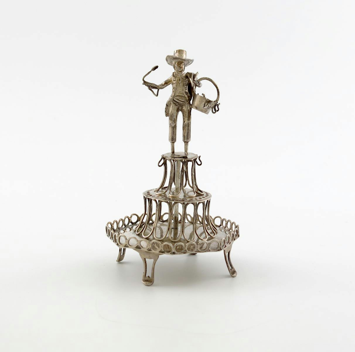 modelled as a figure of a pedlar, on a hexagonal base with a pierced gallery, on four pierced bracket feet, height 13cm.