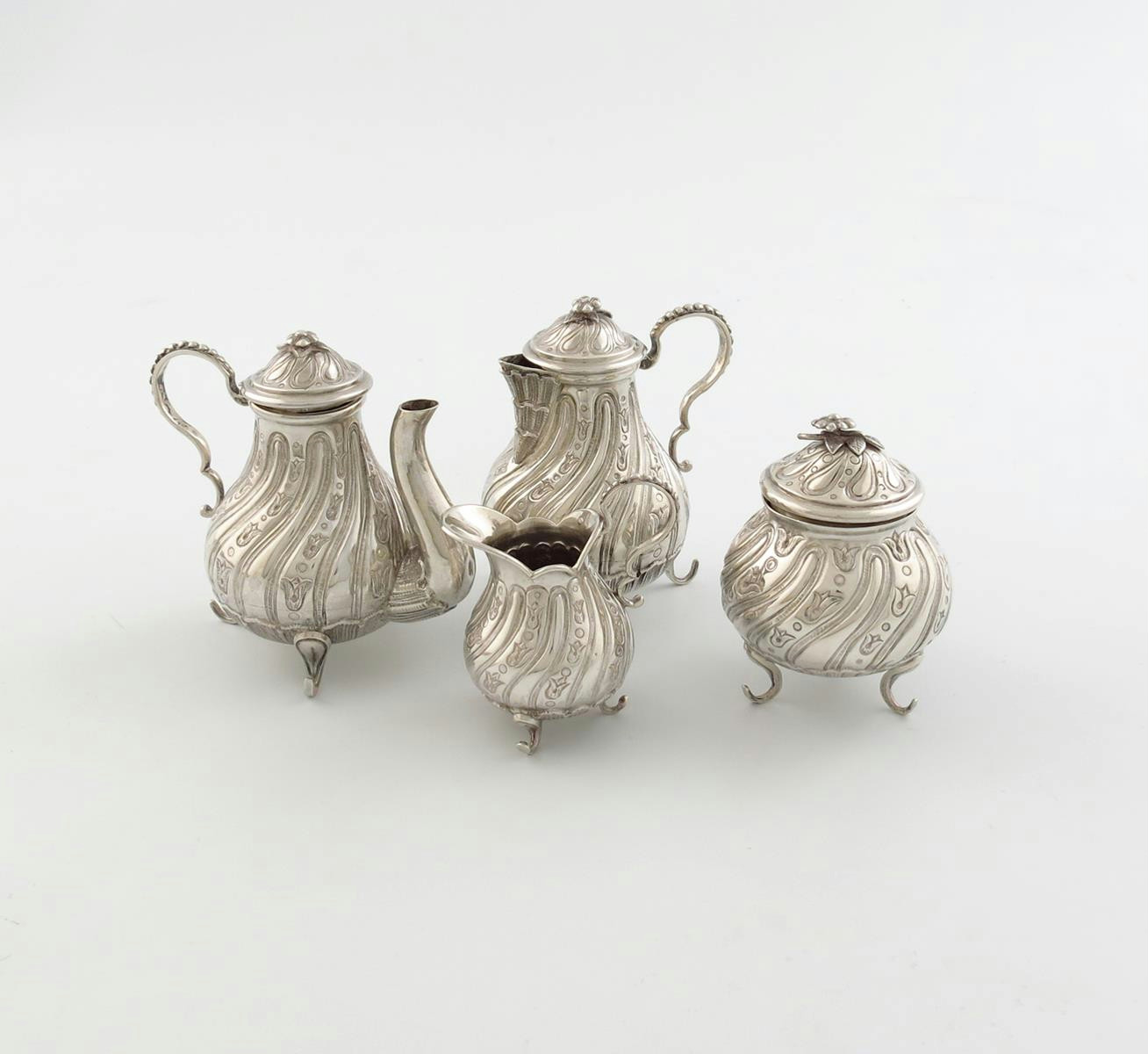 baluster form, swirl fluted decoration, on three scroll feet, domed hinged covers with foliate finials, height of tea pot 10cm. approx. weight 10oz. (4)