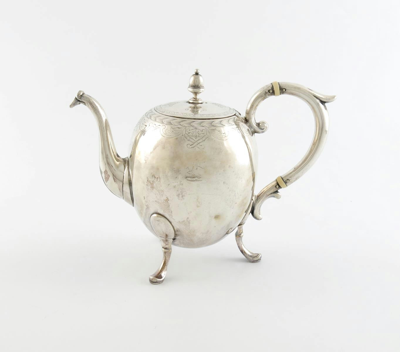 λ A late 19th century continental silver teapot, marked 800M, probably Scandinavian, ovoid form, scroll handle, domed hinged cover with an acorn finial, engraved decoration, on three scroll feet, with a worn crest, height 17cm, approx. weight 15oz.
