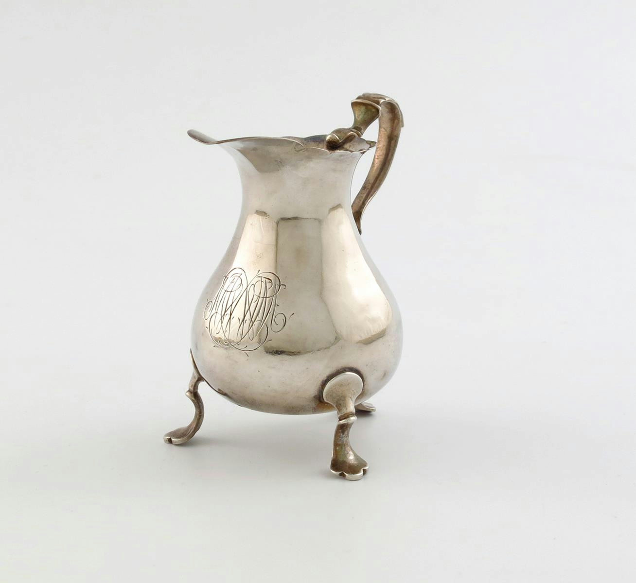 baluster form, wavy-edge border, leaf capped scroll handle, on three hoof feet, engraved with a monogram, height 10cm, approx. weight 3oz.