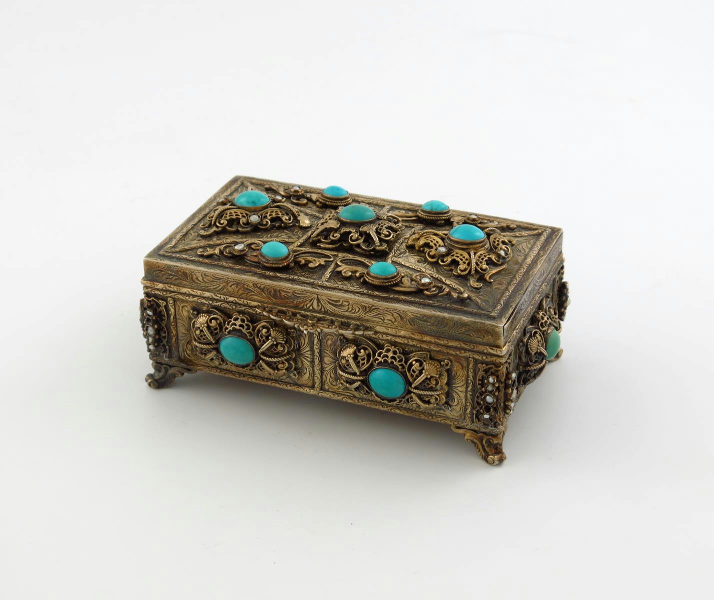 rectangular form, with filigree and turquoise and pearl and engraved decoration, on four bracket feet, wood and velvet lined, length 14.5cm.