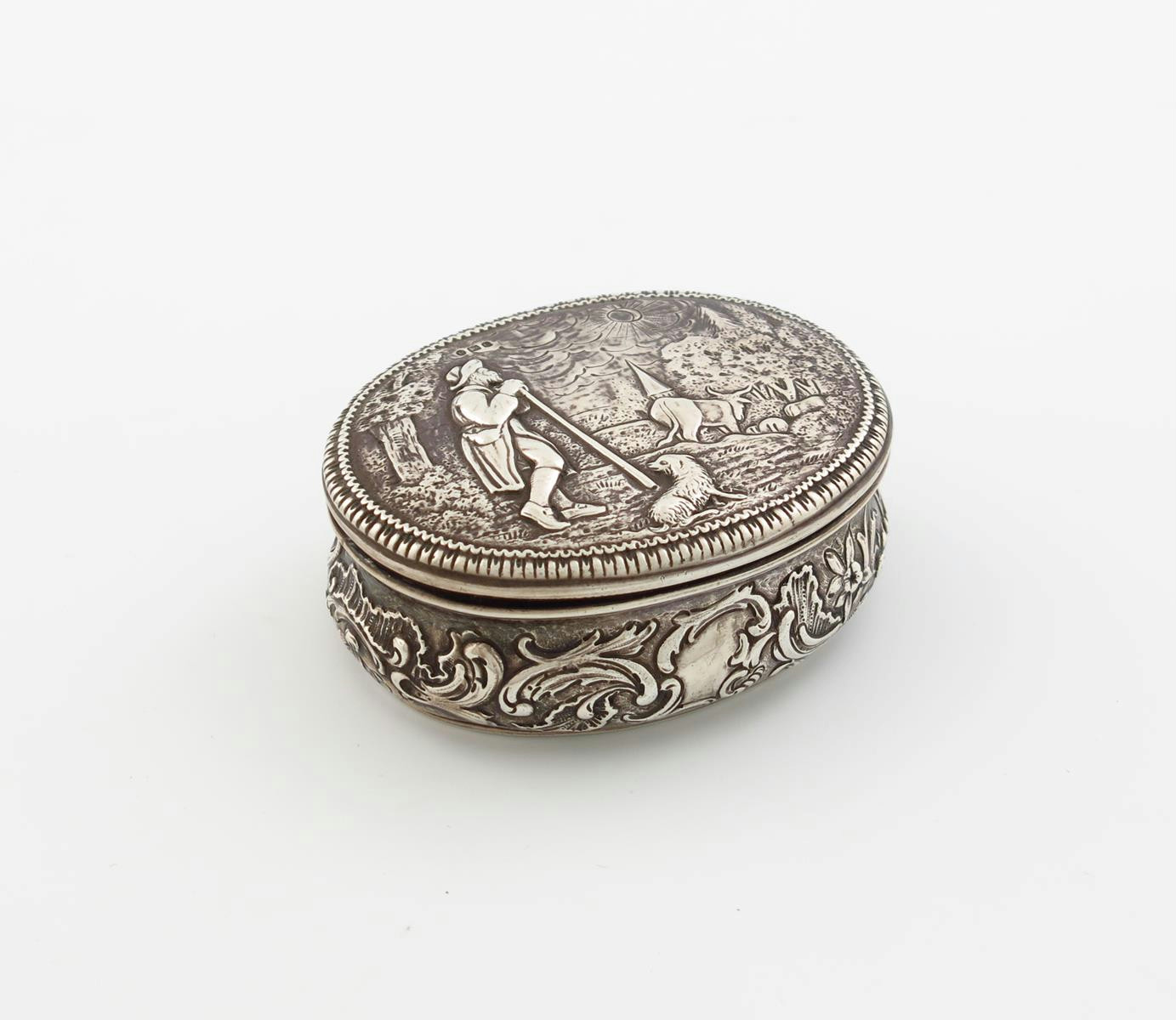 oval form, the hinged cover with a farmer with cows in a landscape setting, embossed foliate scroll sides, length 8.5cm, ap[prox. weight 4.3oz.