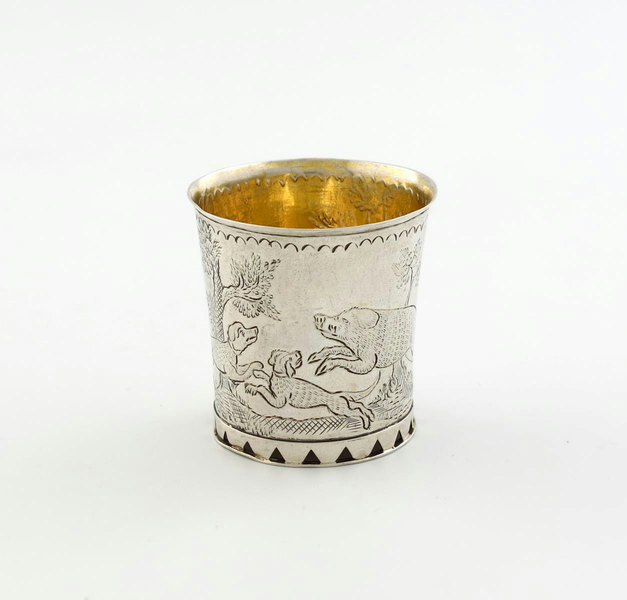tapering circular form, engraved with a scene of a boar hunt, on a pierced circular foot, gilded interior, height 4.7cm, approx. weight 0.7oz.