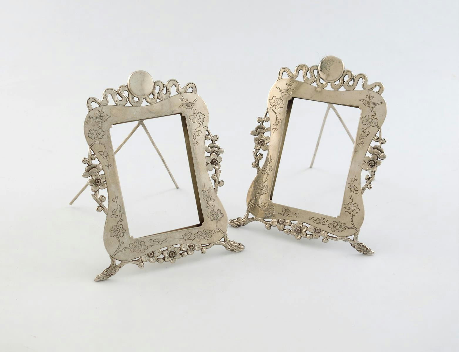 shaped upright rectangular form, with engraved decoration and pierced cherry blossom, with a central circular cartouche, easel backs, height 14cm, approx. weight 3.8oz. (2)