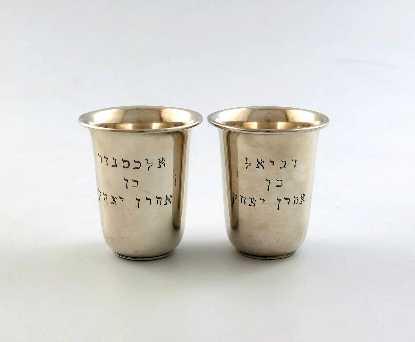 tapering circular form, engraved with the Star of David and names of two brothers, height 7cm, approx. weight 5oz. (2)