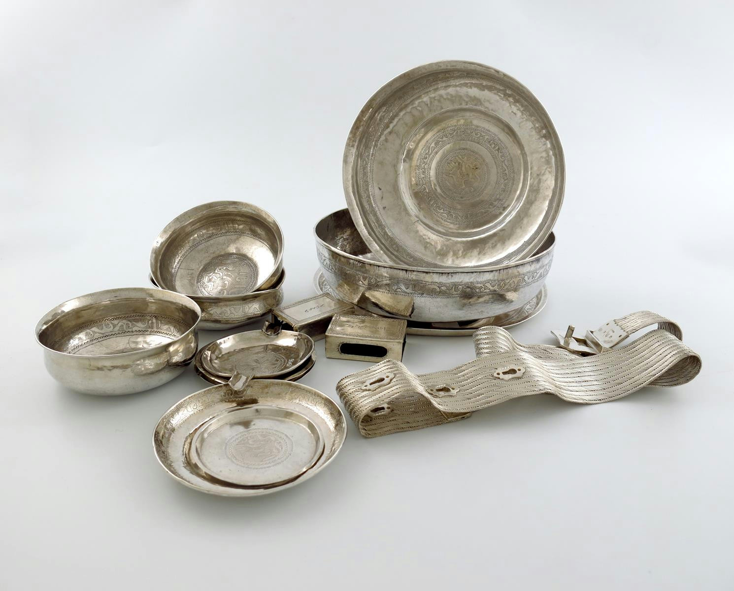 comprising: two shallow bowls, chased decoration, a circular tray, three small bowls, five ashtrays, two match box covers and a belt. (qty)