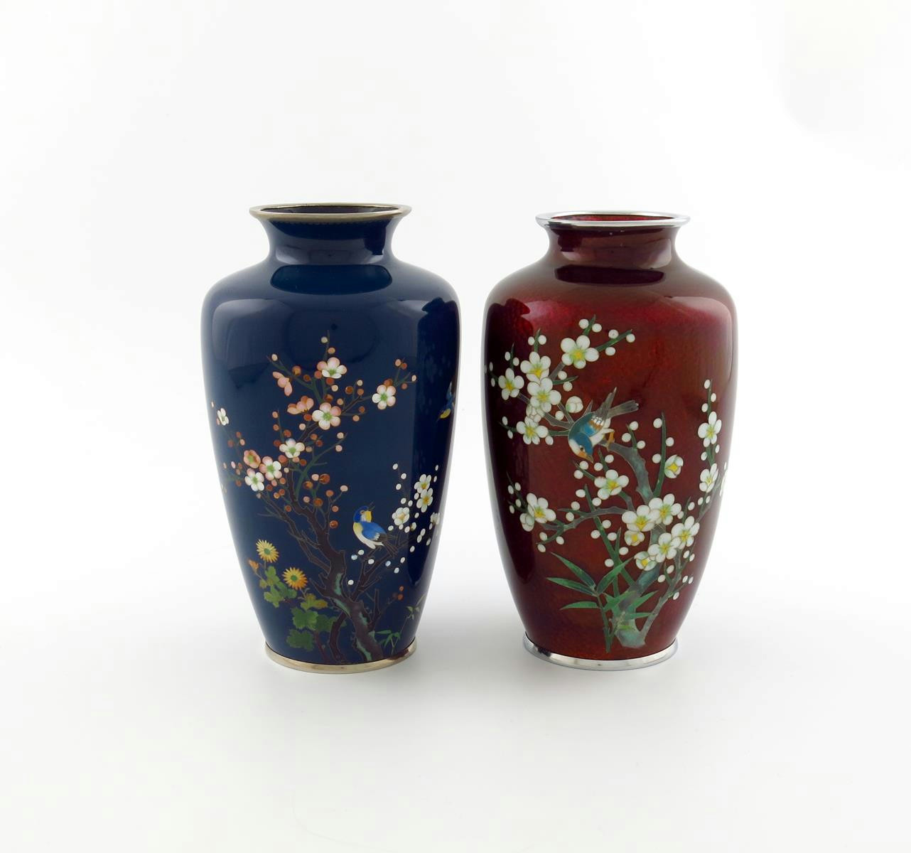tapering circular form, one with blossom and birds on a blue background, the other with similar decoration on a dark red background, heights 18.5cm and 18.2cm. (2)