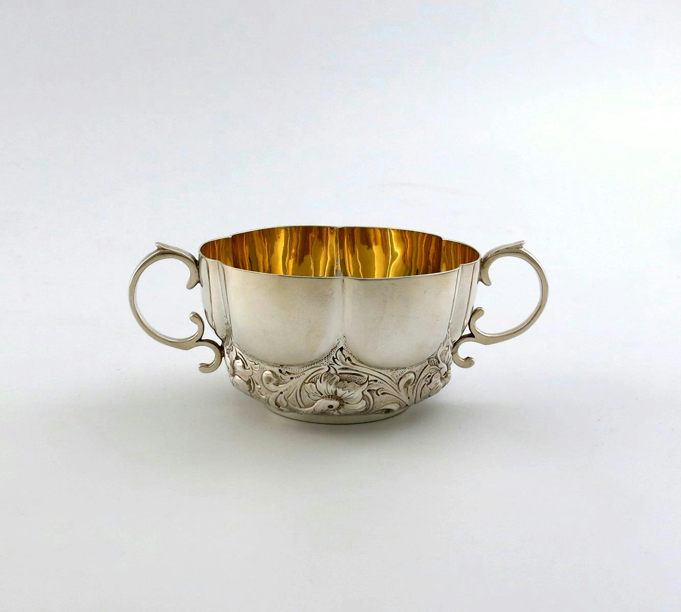 lobed circular form, scroll handles, gilded bowl, embossed foliate decoration, gilded bowl, 17cm, approx. weight 6.5oz.