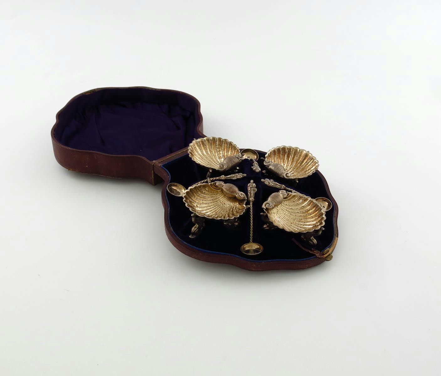shell form, gilded bowls on three mythical dolphin feet, with foru salt celalrs, in a fitted case, approx. weight 3.5oz.