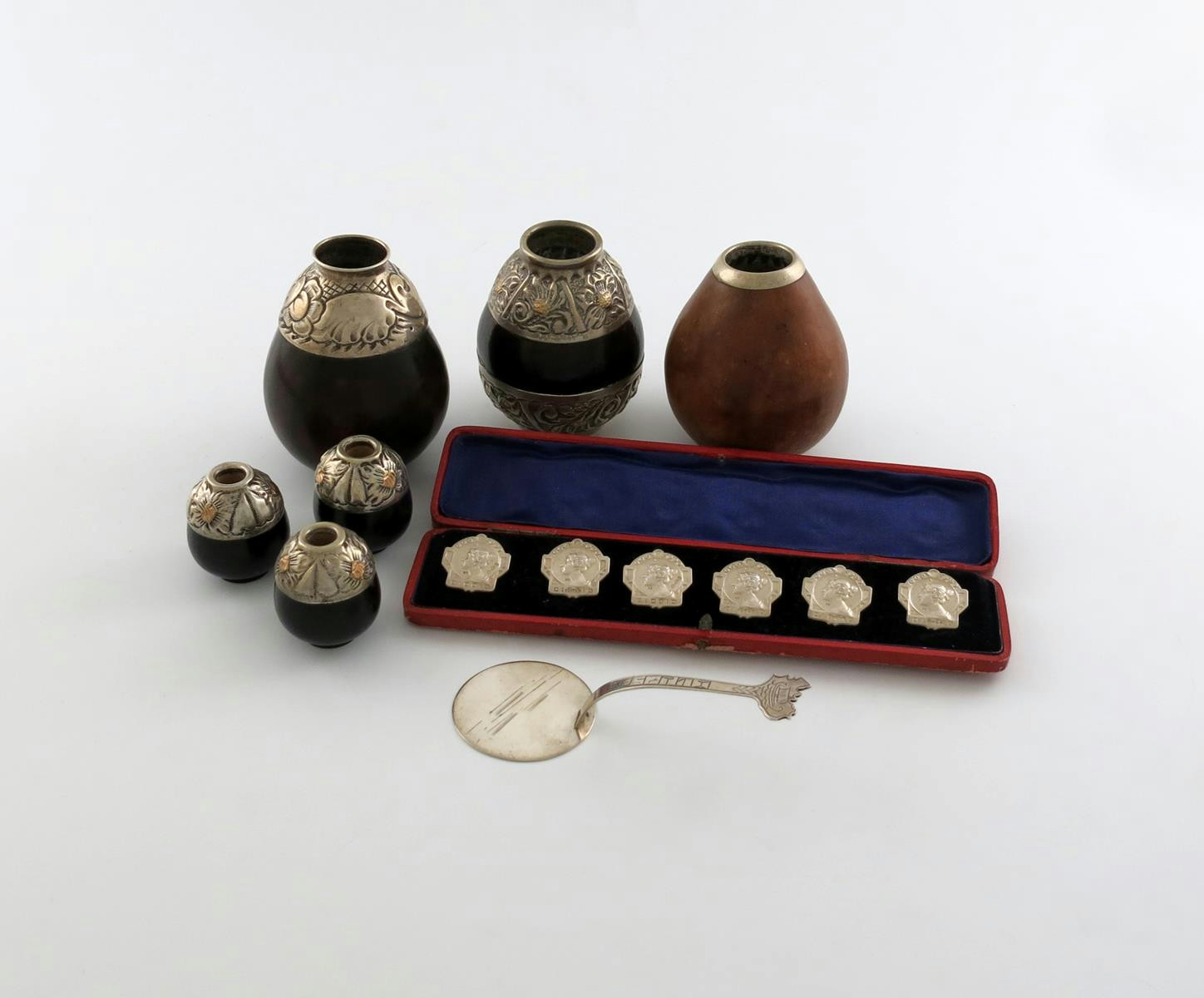 comprising silver items: a cased set of six buttons, with import marks for London 1906, importer's mark of Robert Friederich, with maiden's heads, plus a Scandinavian slide and six electroplated mounted mate bowls. (8)