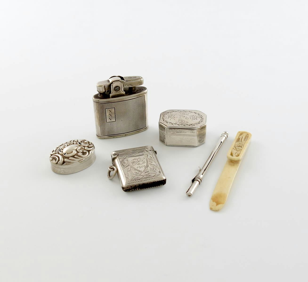λ A mixed lot of silver items: various dates and makers, comprising: a George III nutmeg grater, maker's mark of G.R or G.B, London 1801, rectangular form, canted corners, the cover initialled, hinged cover, pull-off base, lacking grater, length 3.6cm, plus a vesta case, a lighter, a swizzle stick, a small box and an ivory page marker. (6)