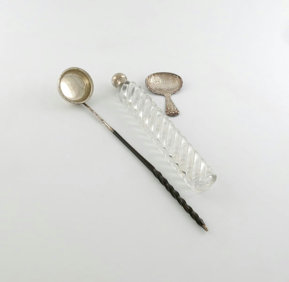 λ A German silver caddy spoon, with import marks for London 1911, importer's mark mark of B. Muller, oval bowl embossed with a tavern scene, the tapering handle with a mask terminal, plus an unmarked late 18th century silver toddy ladle, twisted whale-bone handle, plus a Victorian silver-mounted glass scent bottle, by Middleton Chapman, London 1886, screw-off cover, swirl fluted glass body, length 25.7cm. (3)