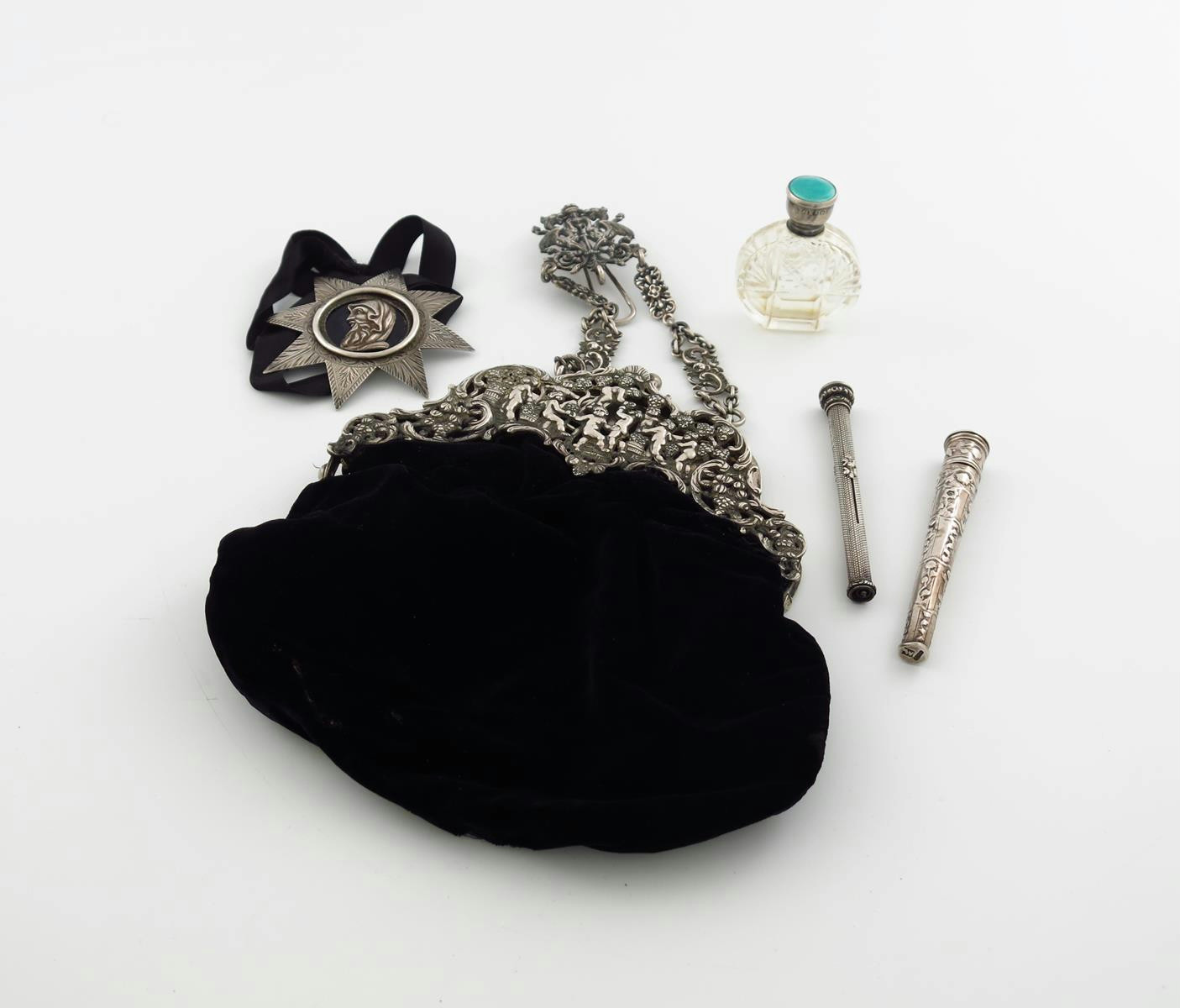 comprising: a Dutch wax case, of tapering form, the cover with a seal matrix, a continental silver-mounted velvet bag, pierced and embossed with cherubs and scroll decoration, with a chain link, plus a Victorian pencil, by S. Mordan, London 1864, a star medallion, and a silver and enamel scent bottle. (5)