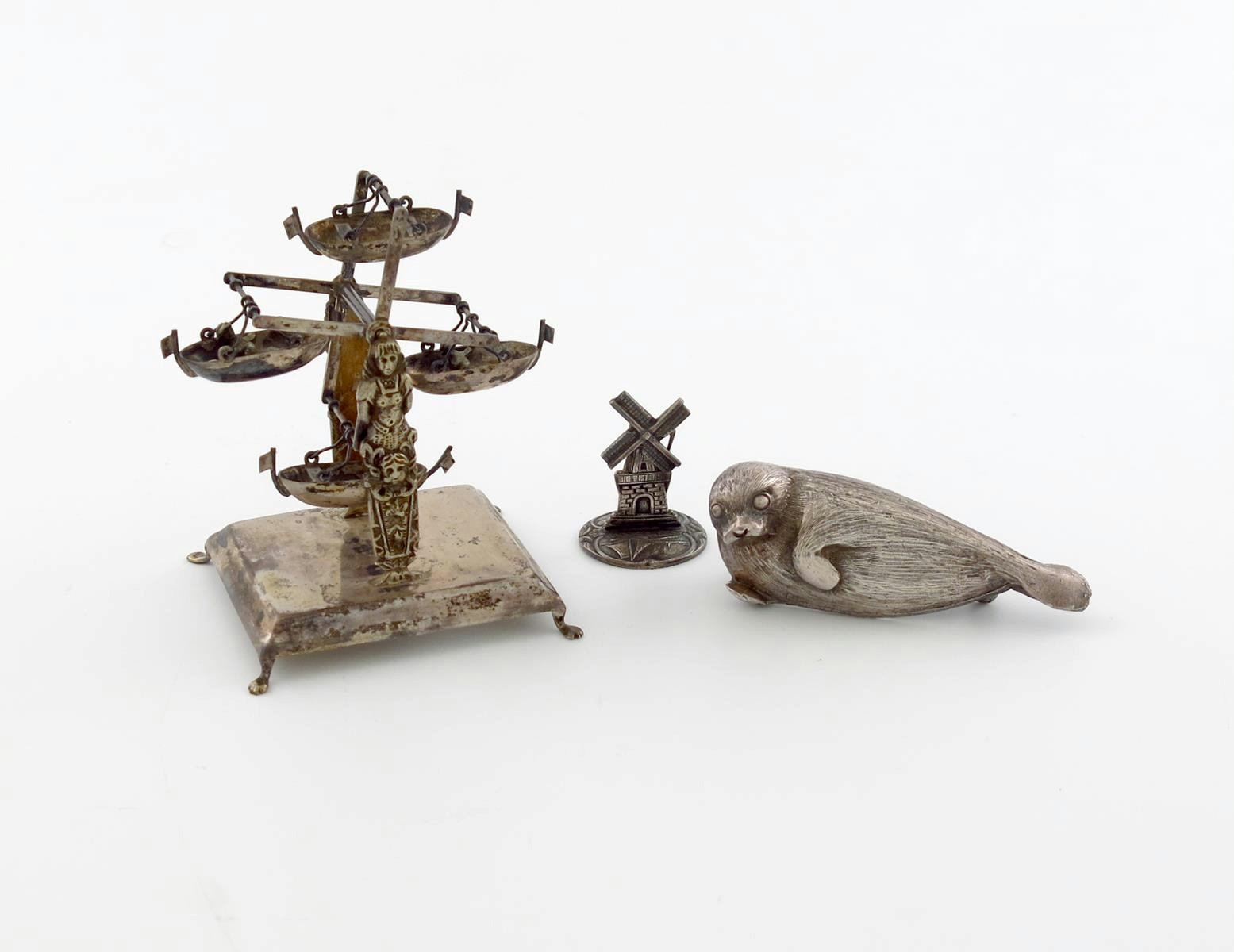 comprising: a modern finial, modelled as a recumbent seal, a miniature toy modelled as a fairground gondola, and a miniature windmill. (3)