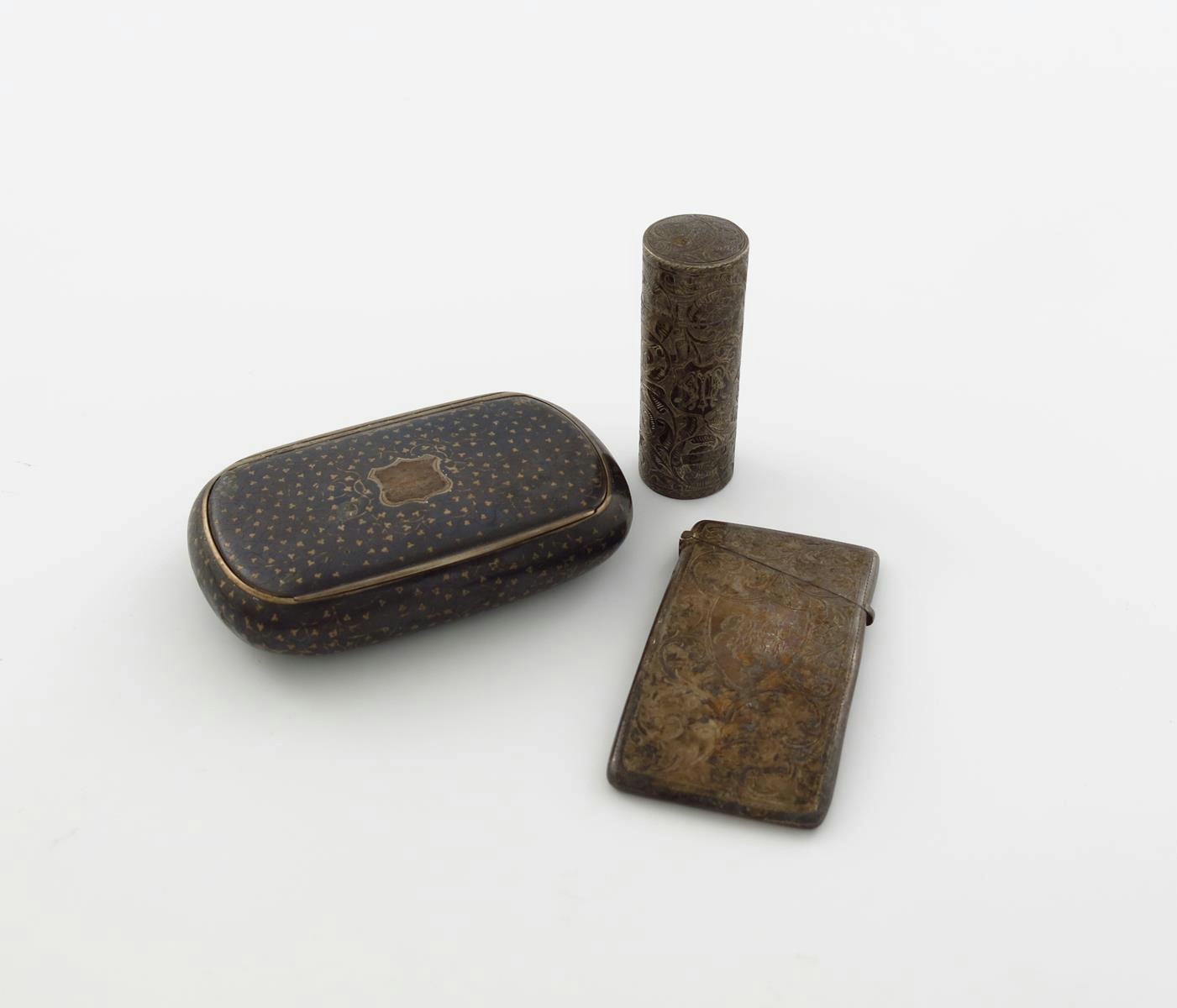 comprising: an Austro-Hungarian silver and niello work snuff box, rounded rectangular form, the hinged cover with a vacant cartouche, a Victorian silver scent bottle, Birmingham 1890, cylindrical form, engraved decoration, a visiting card case, Chester 1907, approx. weight 3.8oz. (3)