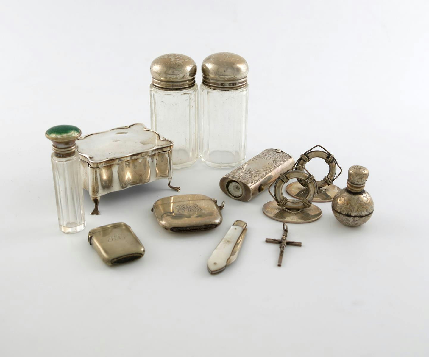 comprising: a pair of menu card holders modelled as life buoys, Birmingham 1913, on circular bases, a trinket box, two vesta cased, a scent bottle, a torch, with engraved decoration, a fruit knife, three toilet bottles and a crucifix, approx. weighable 4oz. (12)
