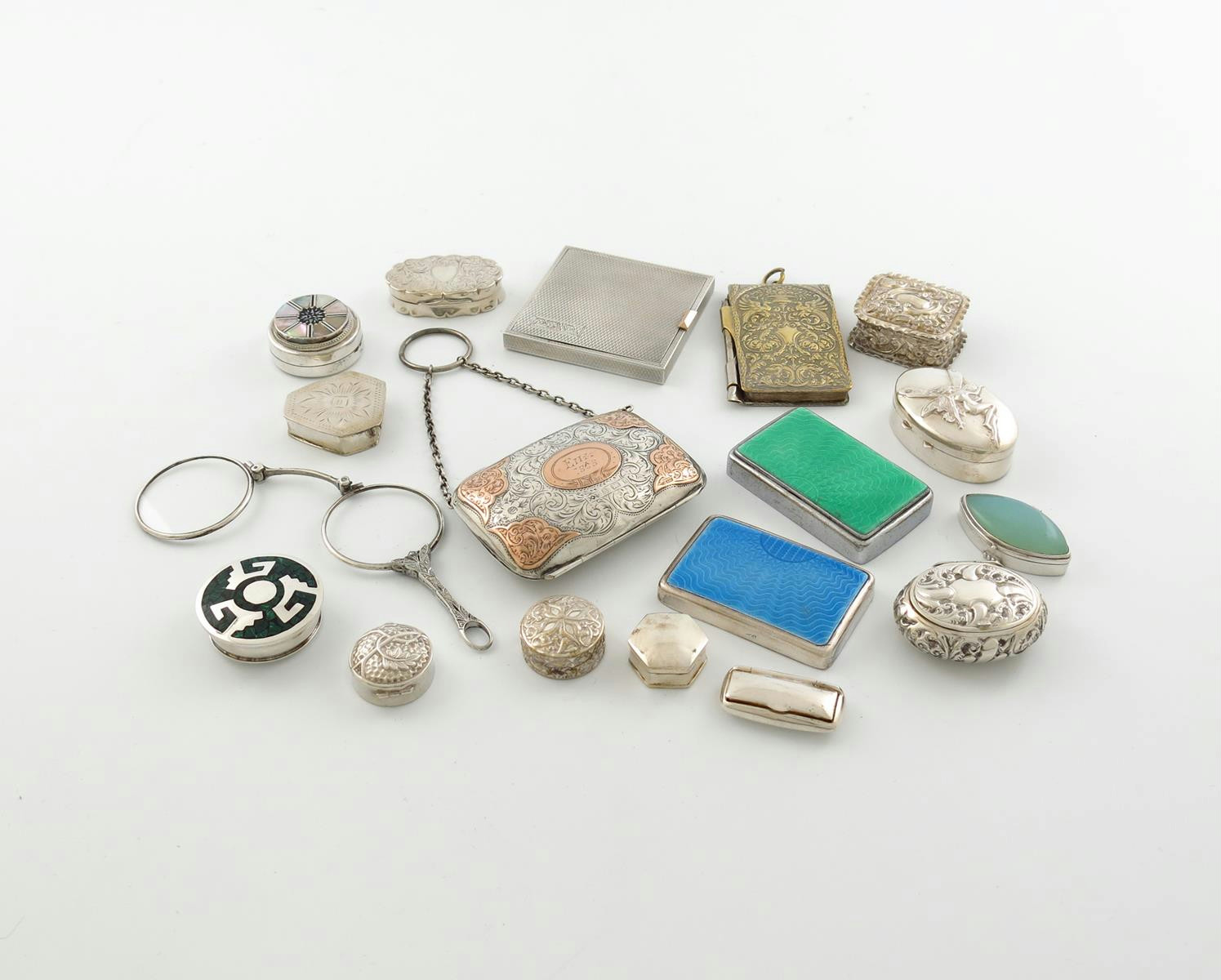 comprising silver items; a purse of rectangular form, with gold mounts and a chain and ring handle, a compact of square form, engine-turned decoration, an oval snuff box, three other boxes, plus eight modern silver and metalware boxes, and electroplated items; a pair of lorgnettes, an aide memoire and two enamel lids. (qty)