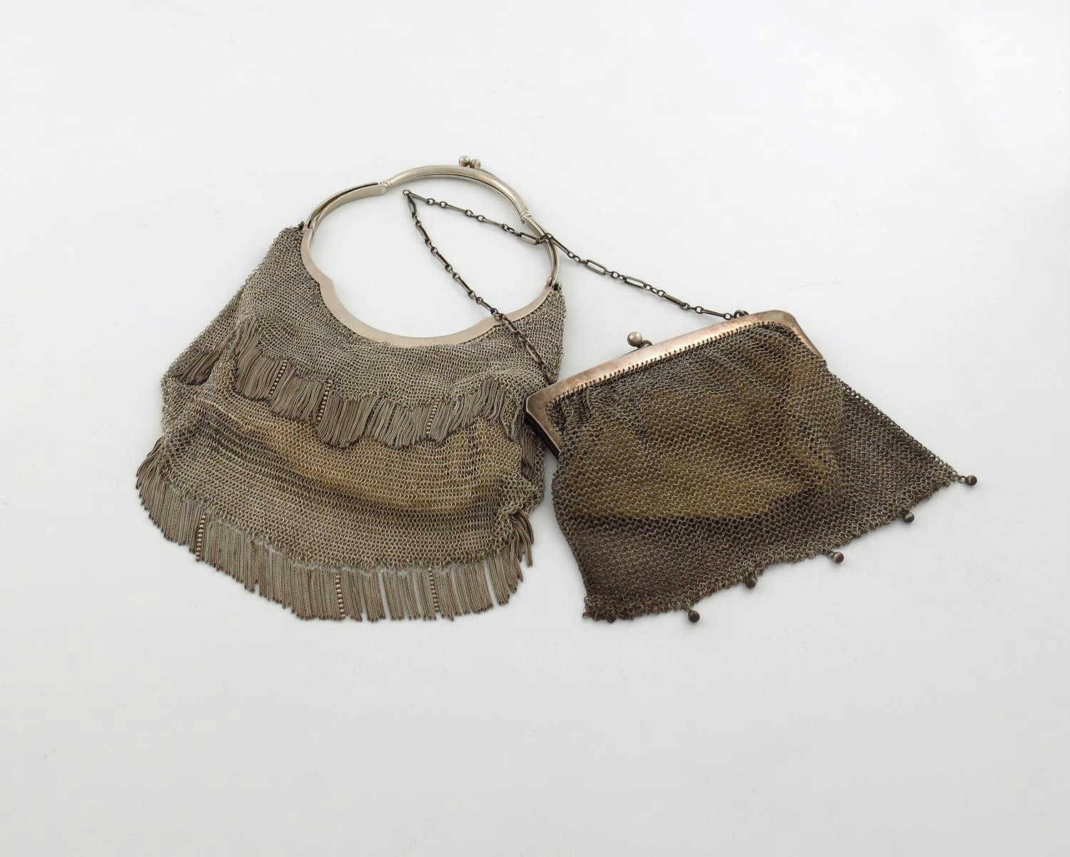 with a shaped circular 'X' frame handle, with two layers of hanging decoration, length 30cm, plus another German silver mesh bag of rectangular form, approx. weight 16oz. (2)