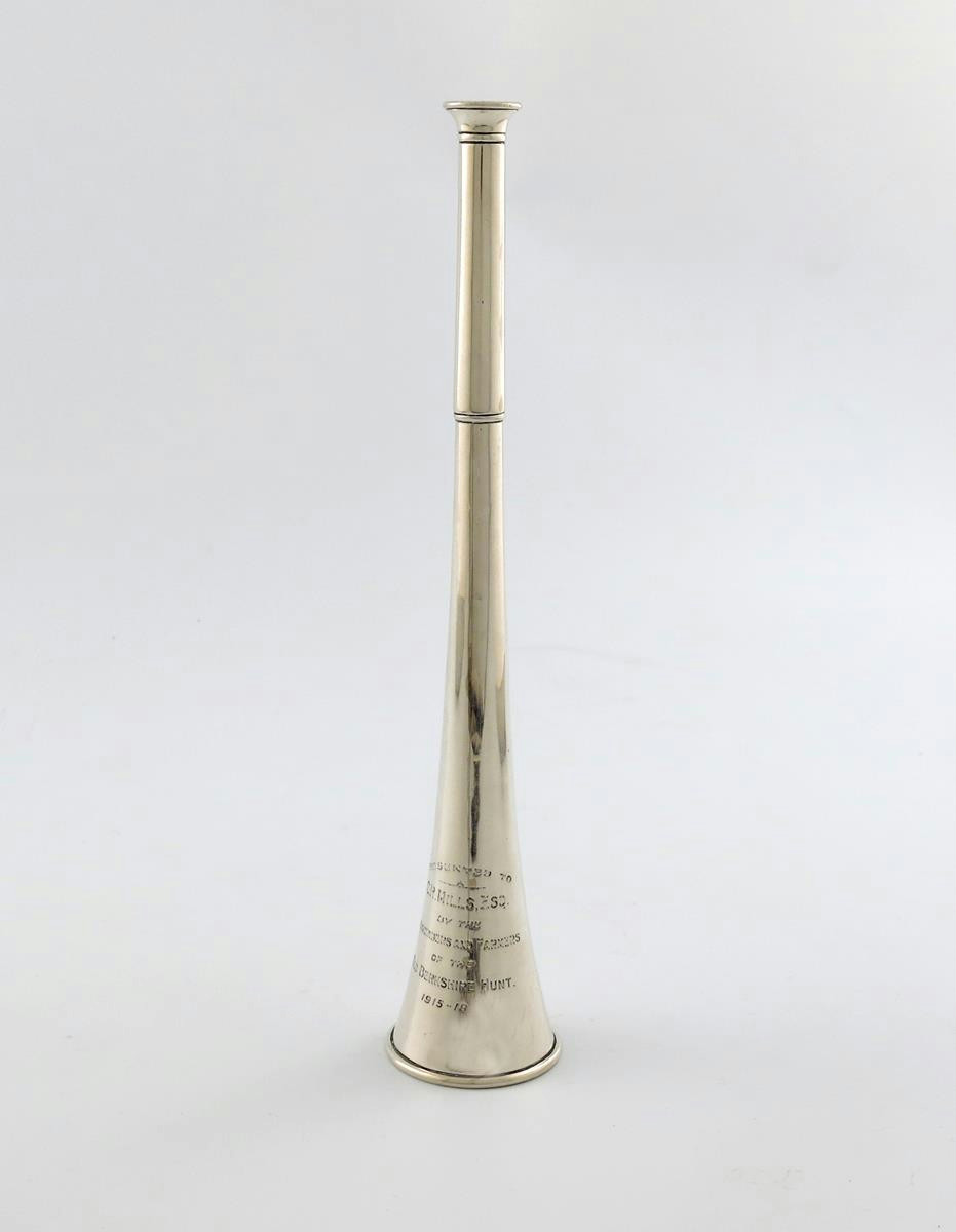 tapering circular form, inscribed 'Presented to C. R. Mills, Esq. by the Subscribers and Farmers of the Old Berkshire Hunt 1915-18', length 26.5oz, approx. weight 4.2oz.
