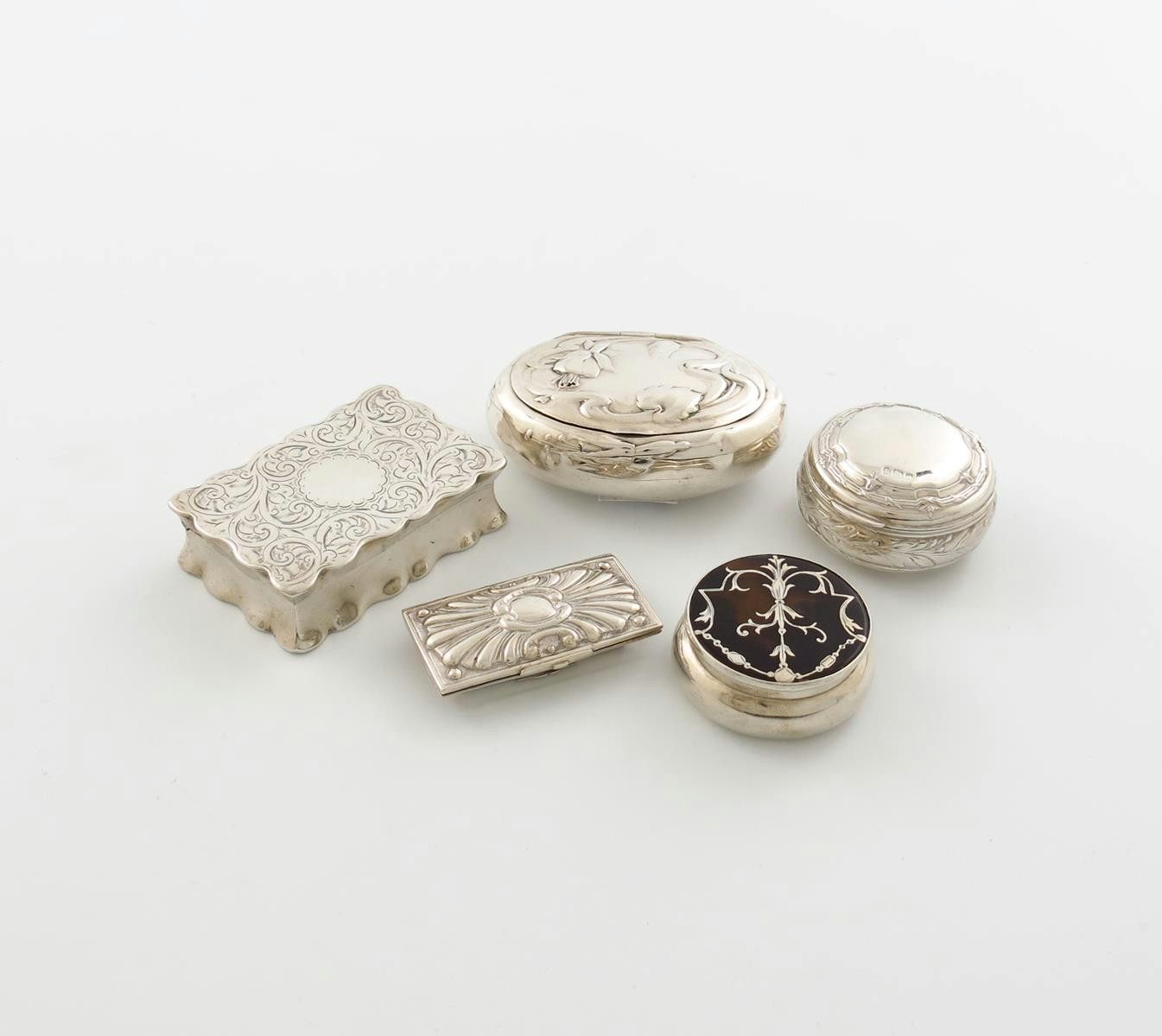 λ A small collection of five silver boxes, various dates and makers, comprising: a snuff box of rectangular form, Birmingham 1914, an oval box with Art Nouveau decoration, a silver and tortoiseshell box, and two other boxes, approx. weight 4oz. (5)
