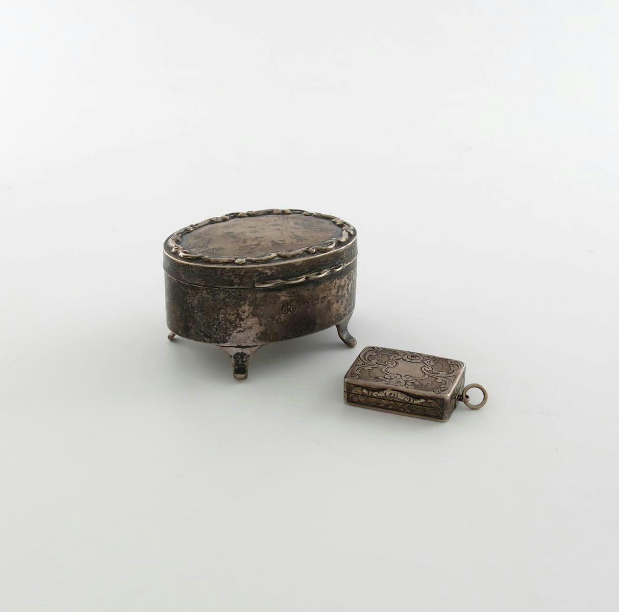rectangular form, engraved foliate scroll decoration on an engine-turned background, the interior with a pierced and engraved foliate scroll grille, length 3.3cm, plus a silver ring box of oval form, foliate scroll border, on four bracket feet, length 6.8cm. (2)