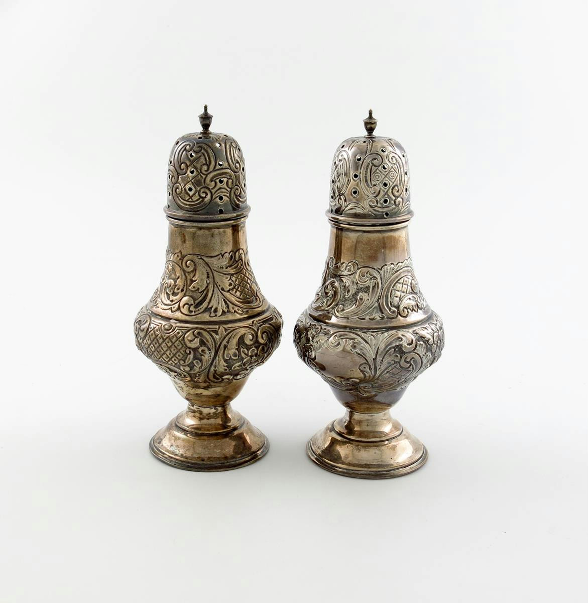 baluster form, embossed foliate decoration, urn finials, on raised circular bases, height 19cm, approx. weight 8.5oz. (2)